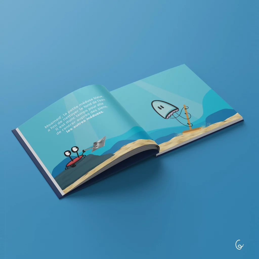 Moamed’ est une petite méduse bleue qui vit dans la Mer Méditerranée. Dans ces livres, imaginés pour les petits, Momo la méduse vit des aventures qui font échos aux situations qu’un enfant pourrait vivre au quotidien ; discrimination, moqueries, différence physique etc… Chaque histoire donne une issue positive à ces situations. Le livre devient alors un support pour aider les parents à faire passer un message et expliquer une morale.